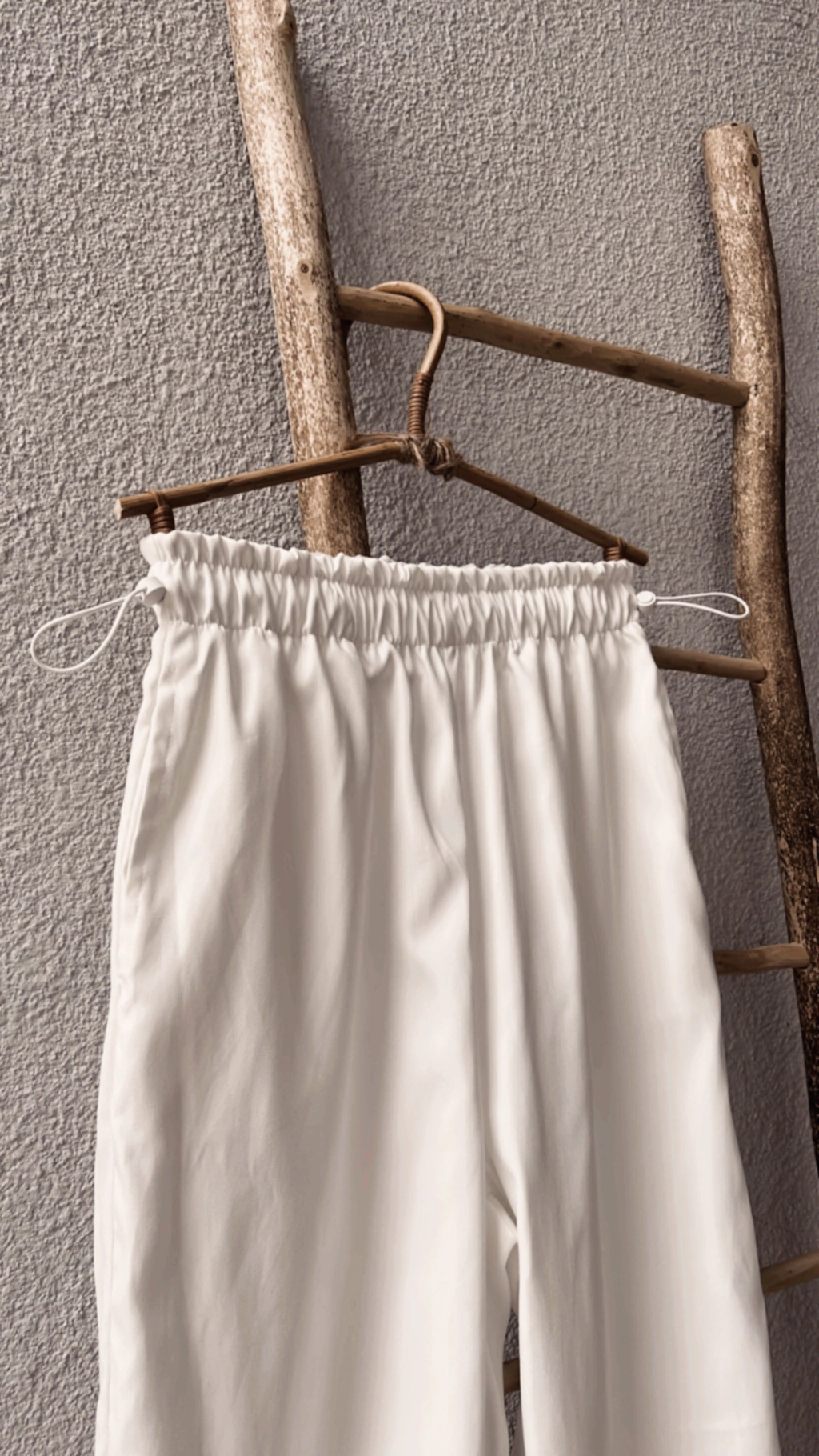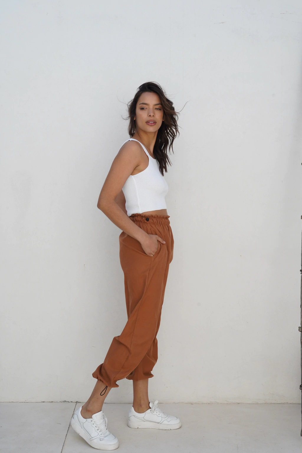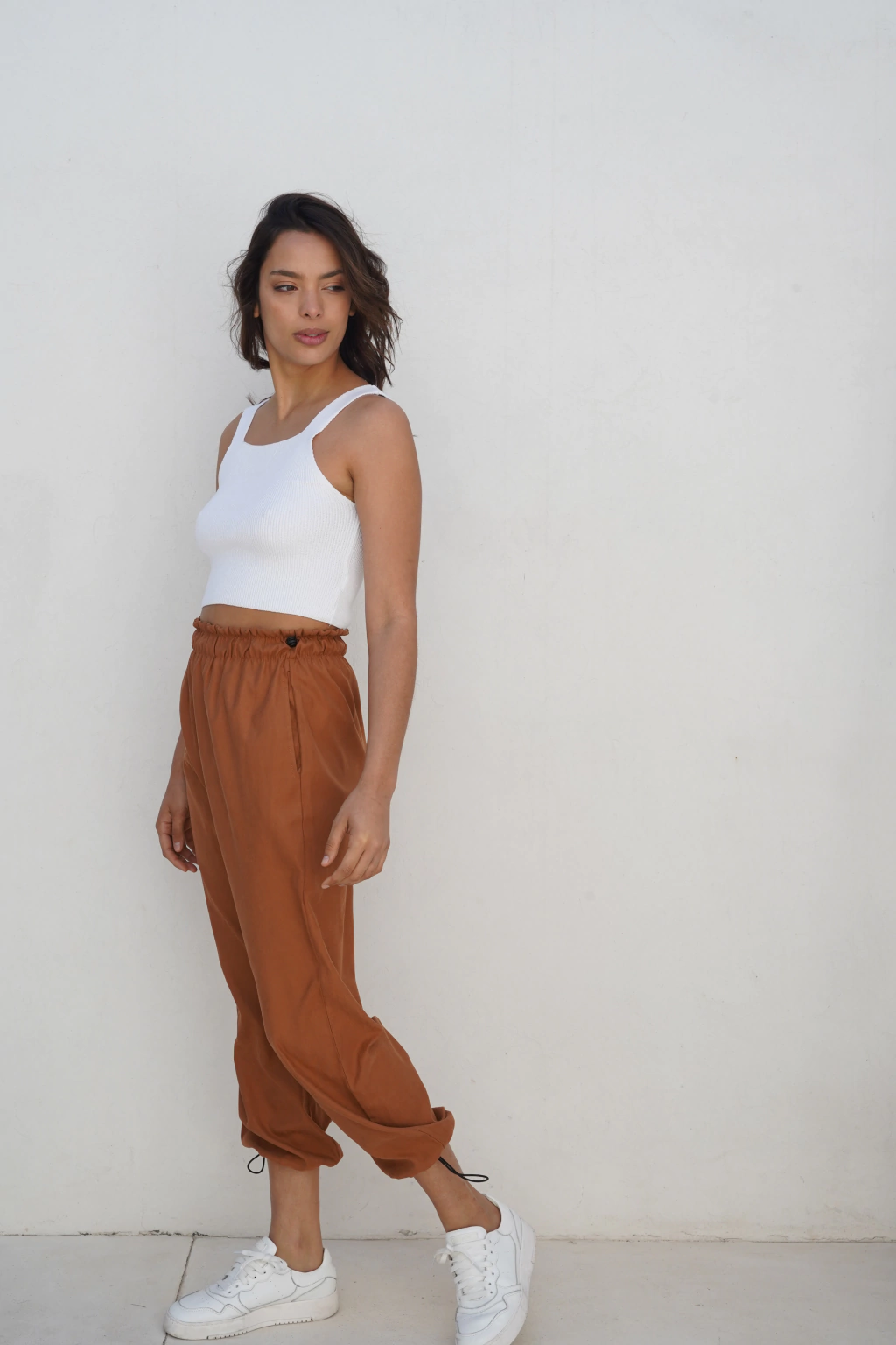 Pantalon con corte Parachute confeccionado en cupro, es una tela plana y suave, con bolsillos en los costados y elastico en la cintura y botamangas con tancas