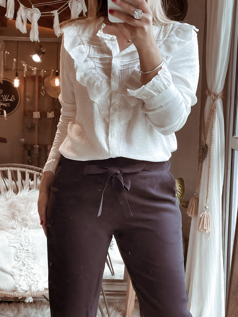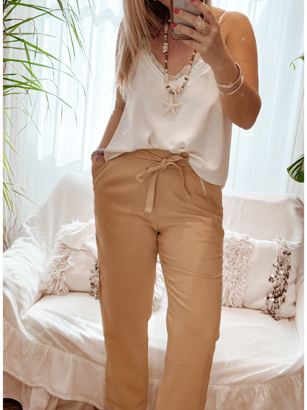 Pantalon al tobillo tiro medio con lazo para anudar en la parte delantera y bolsillos con elastico en la cintura trasera .Tela : TencelMedidas aproximadas ( aconsejamos que siempre te guies por las medidas en cm y que las compares con una prenda tuya )NATY USA TALLE 2 y tiene talle 38 -40 de jeanTalle 1 ( lo sugerimos para un talle 36 )Cintura:34 cmCintura estirada: 46 cmCadera : 48 cmTiro:29 cmLargo :88 cmTalle 2 ( lo sugerimos para un talle 38/40 )Cintura:35 cm Cintura estirada: 49cmCadera : 49cmTiro: 30 cmLargo :88 cmTalle 3 ( lo sugerimos para una talle 42/44)Cintura:38cm Cintura estirada: 51cmCadera : 51 cmTiro:31 cmLargo :89 cmRecomendaciones: Este tipo de prendas son delicadas y deben lavarse a mano con jabon neutro y secar tendido de una percha a la sombra