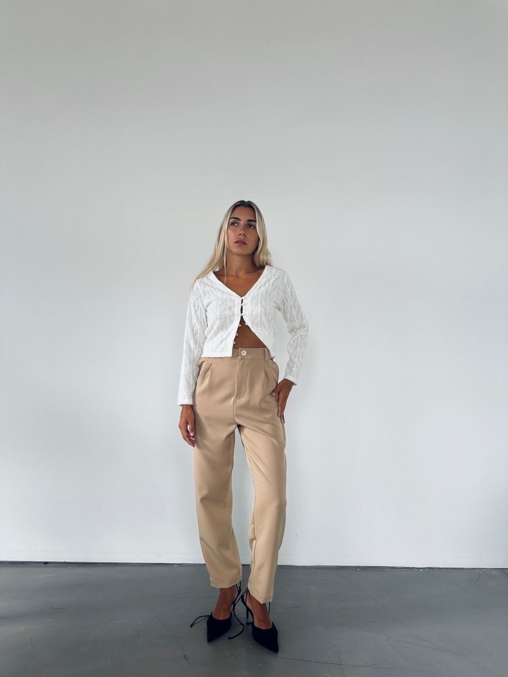 Pantalón sastrero pinzado con bolsillos laterales, falso bolsillo en espalda y en la cintura avíos metálicos para ajustar. MEDIDAS: T1: contorno de cintura: 64 cm.,(cede hasta 72 cm.), contorno de cadera: 90 cm., largo de la prenda: 94 cm. T2: contorno de cintura: 66 cm.,(cede hasta 74 cm.), contorno de cadera: 95 cm., largo de la prenda: 95 cm.