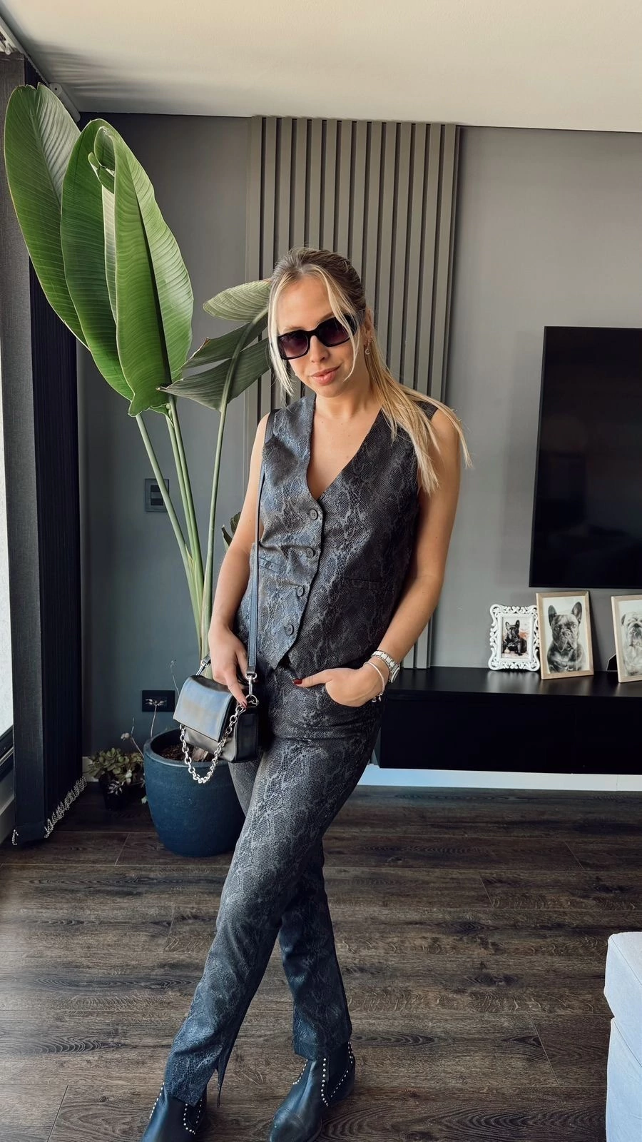 Pantalon recto de cinco bolsillos con presillas en la cintura y canesu en la espalda. Posee cierre y boton metelico . Estampa print sobre bengalina. Composicion, rayon, nylon y spandex.