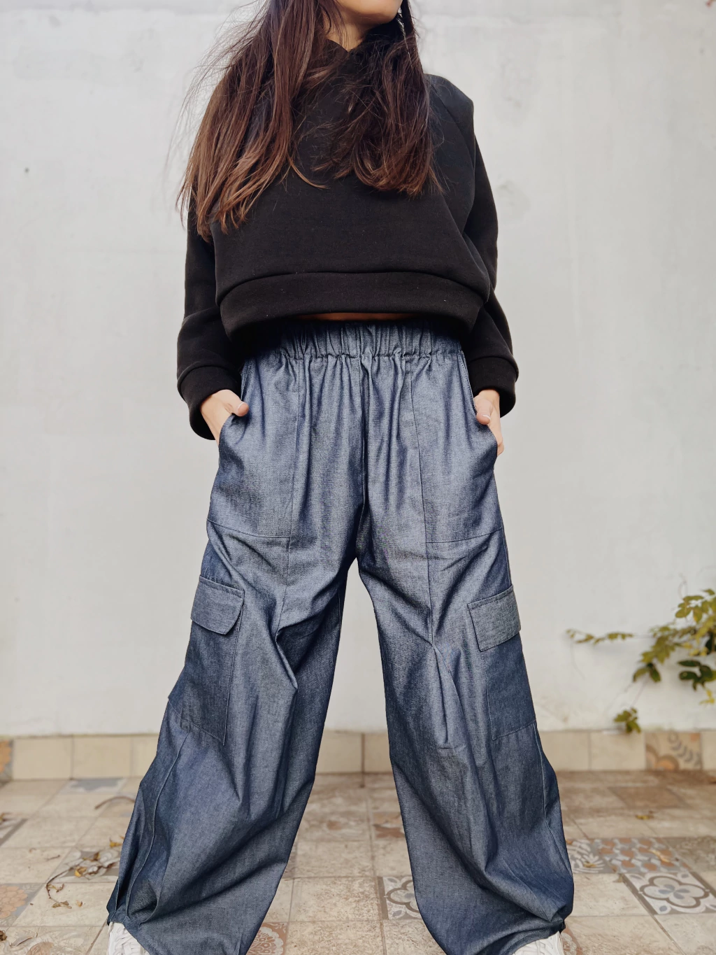 Pantalón de Jean camisero. Babucha con bolsillos cargo