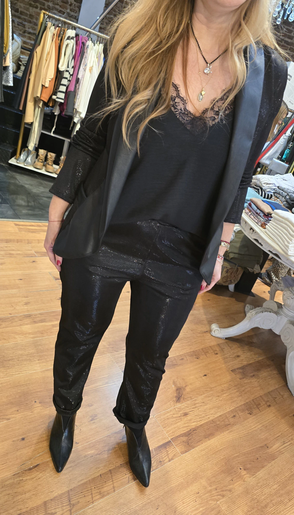 Descubre el sofisticado pantalón corte semi recto elaborado con 2% de elastano, que otorga comodidad y estilo. Su tela foil texture es perfecta para la noche, eventos y cócteles.