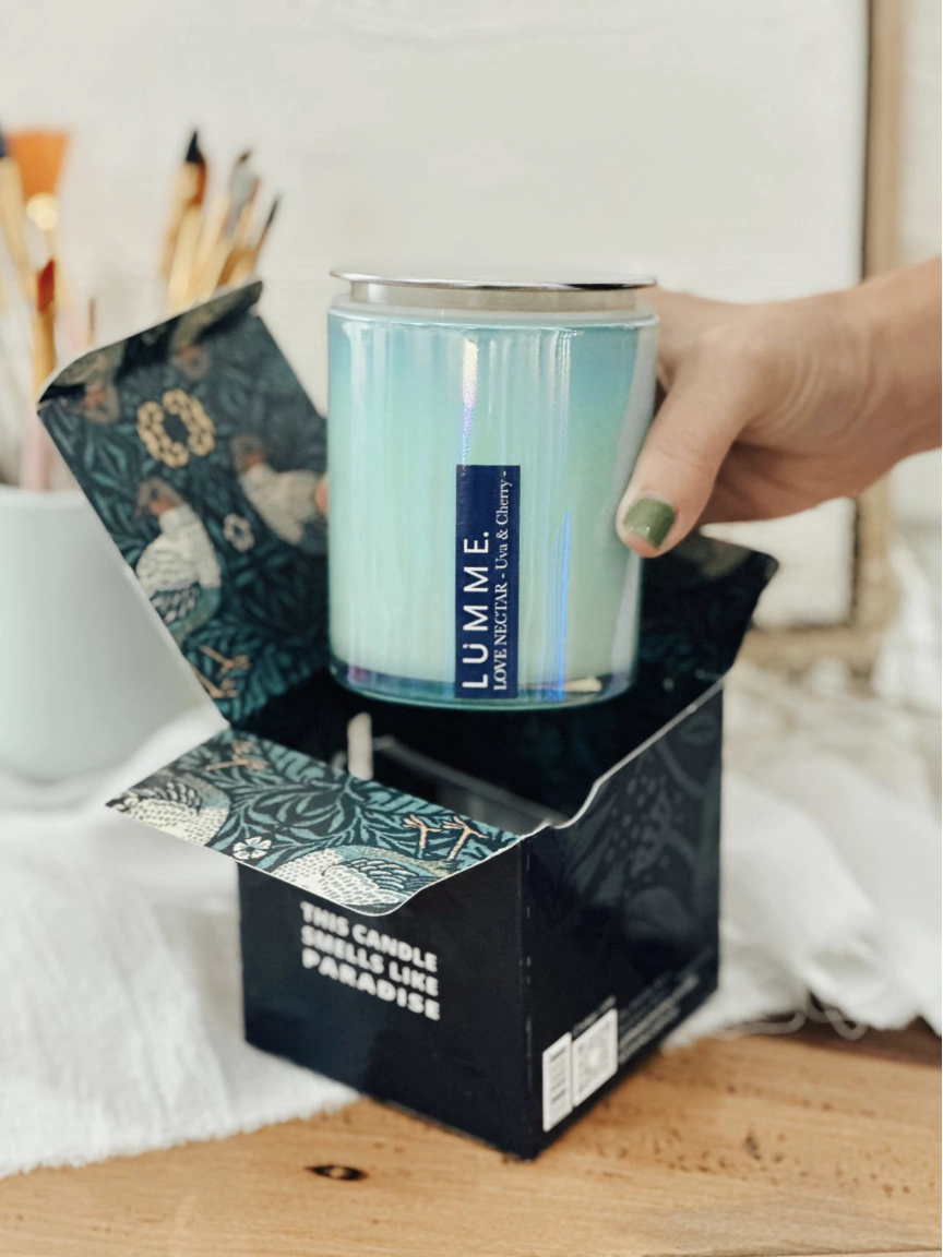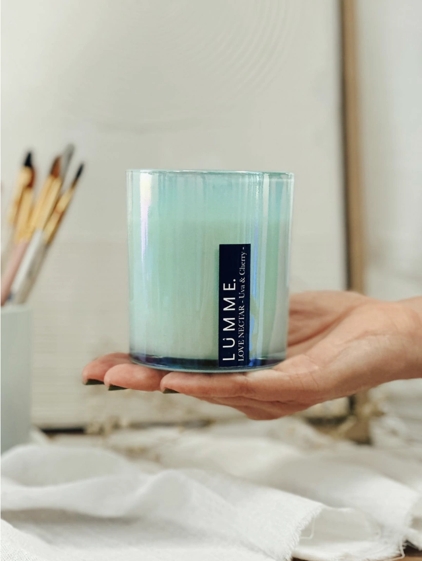 Vidrio en color holográfico tornasol con tapa de Acero Espejado.