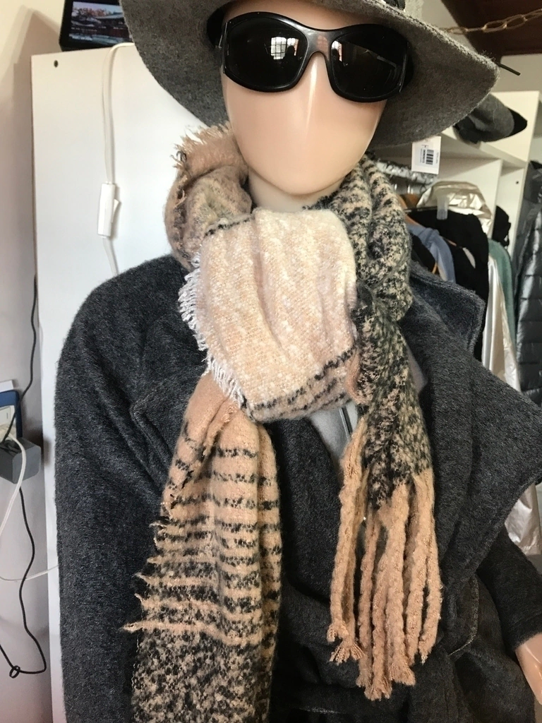 Pashmina de lana, en tonos marrones, beige y negros. Con flecos. Medidas: 70 cm x 2 metros
