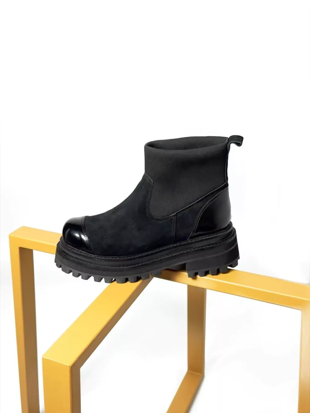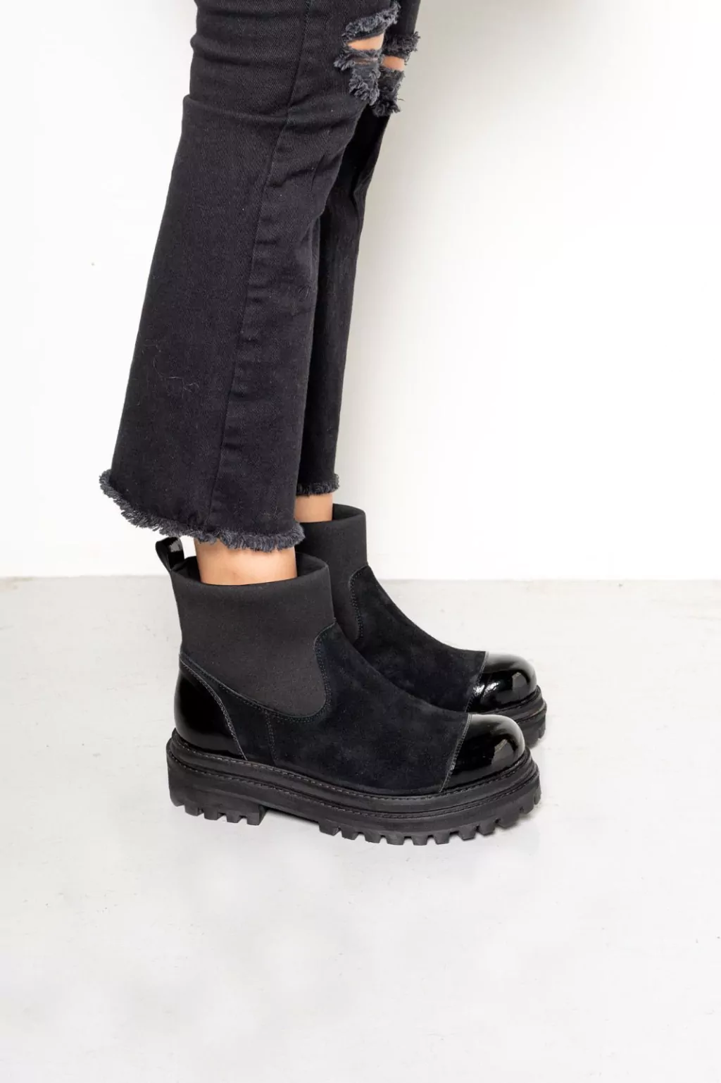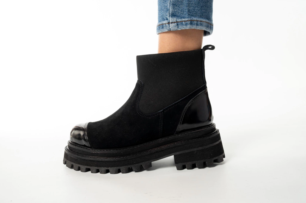 Botas confeccionadas en cuero vacuno gamuzado combinado con neoprene y charol negro.Forro vacuno al tono.Fondo artesanal de goma eva con doble vira y suela de caucho.Altura de fondo: 4,5 cm adelante y 5 cm atrás.Horma regular. Súper livianas y cómodas!