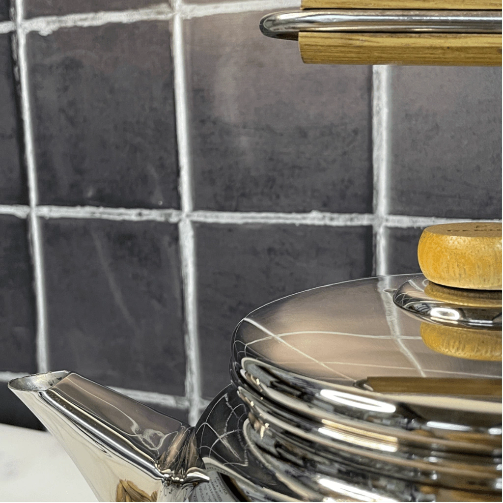 - Mango de madera labrado anti térmico unida a la manija de acero, transformando ambas piezas en una sola