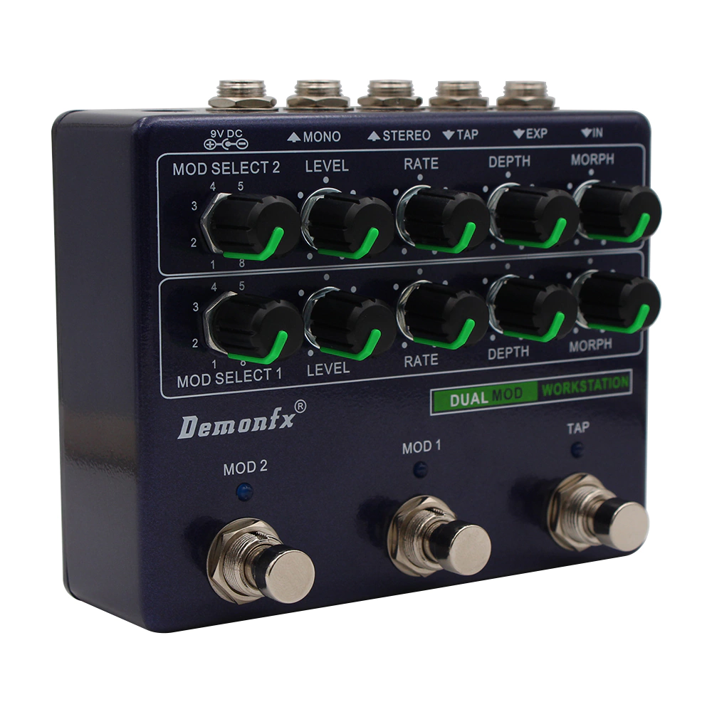 Sumérgete en un paisaje sonoro lleno de tonos modulados y envolventes. Pocos efectos pueden ser tan provocativos como un tremolo entrecortado, un efecto de altavoz rotatorio girando, un chorus etéreo o un filtro loco. Nada se compara con un flanger grueso o un tremolo armónico profundo. Y lo mejor que puedes añadir a estos efectos de modulación es delay y reverb. Con la Dual Mod Workstation, puedes combinar 2 efectos a la vez, creando un paisaje sonoro casi infinito. Con tap tempo y un pedal de expresión, tendrás a tu disposición todas las herramientas necesarias para crear una asombrosa variedad de sonidos.