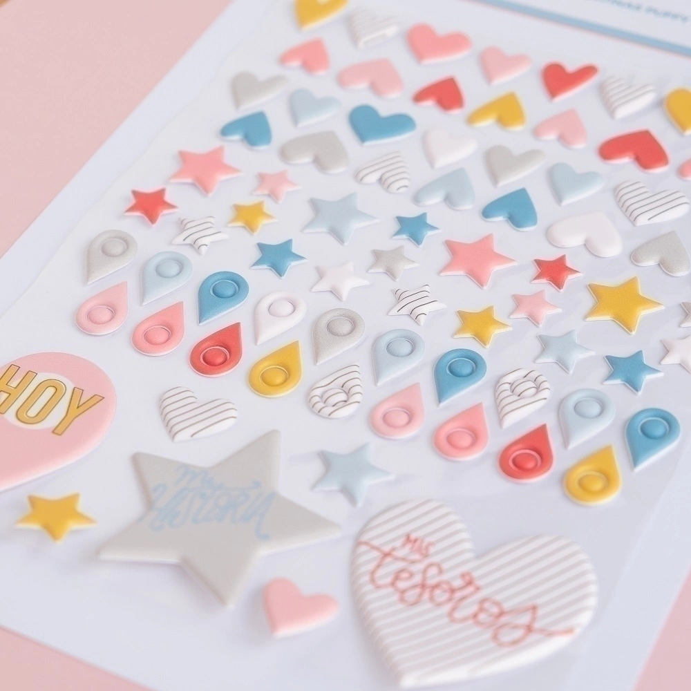 Pegatinas autoadhesivas de efecto puffy o acolchado.Tamaño hoja: 15 cm x 20 cm.Cantidad: 77 piezasColección: My StoryMarca: Kimidori Colors.