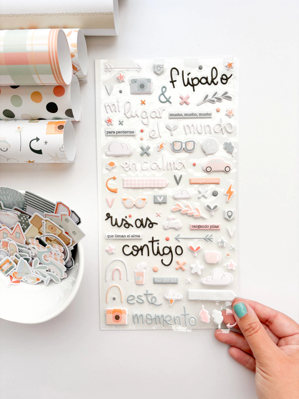 Set de 87 unidades pegatinas puffy, incluye frases, ilustraciones y pequeños diseños a juego con la colección Latte.