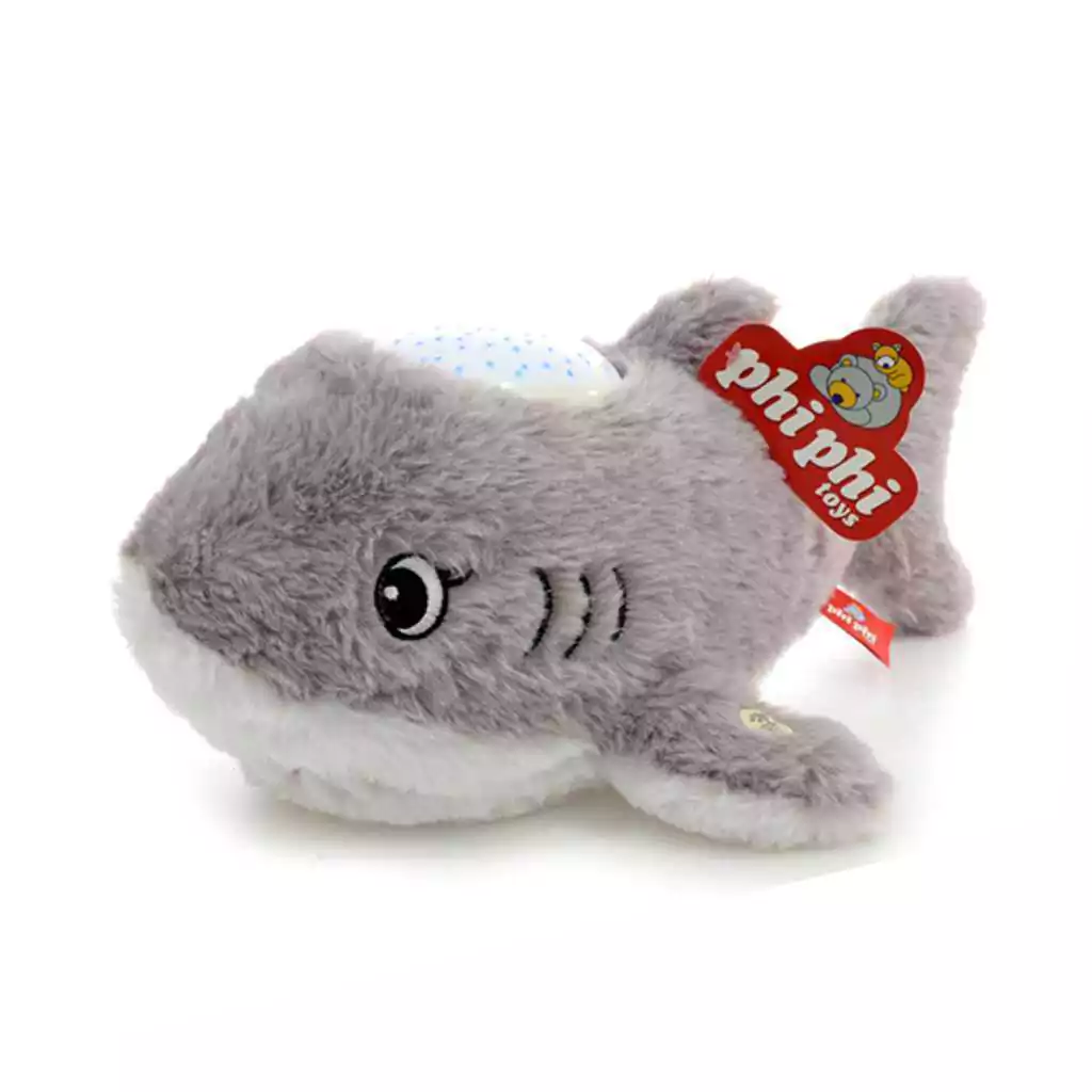 DetallesHermoso Proyector Peluche ideal para acompañar a tu bebé a dormir y relajarse con los sonidos del mar.Vienen con protección y sonido de marMedidas del tiburon: 32cm de ancho x 14cm de alto.