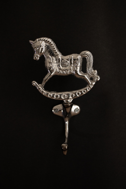 Percha con diseño caballito de madera fabricado en bronce cromo brillante.