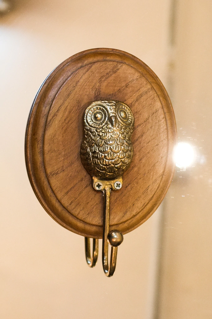 PERCHERO CON BASE DE MADERA CON DISEÑO BÚHO FABRICADO EN METAL DORADOMEDIDAS:Alto total: 20 cmAlto de la base: 16,5Ancho: 13,5Profundidad: 5 cm