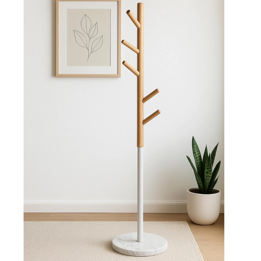 Perchero NórdicoEstructura metálica negraPie metálico negro combinado con madera.Medidas: Altura 173cm. Diámetro de la base 28cm.Armado muy fácil!