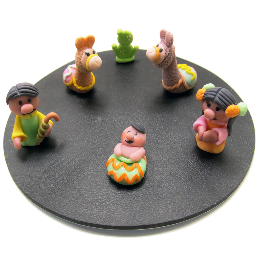 Pesebre andino de porcelana fría con muchos detalles artesanales, compuesto por 6 figuras:hombre (5cm), mujer (5cm), llamitas x2 (6cm), bebe (5cm largo) y cactus (3cm).Representación del nacimiento del niño Jesús en el pesebre, con características típicas de la cultura norteña. Hechos a mano y pintados con tinturas de la región. Ideal para obsequiar en estas Fiestas.