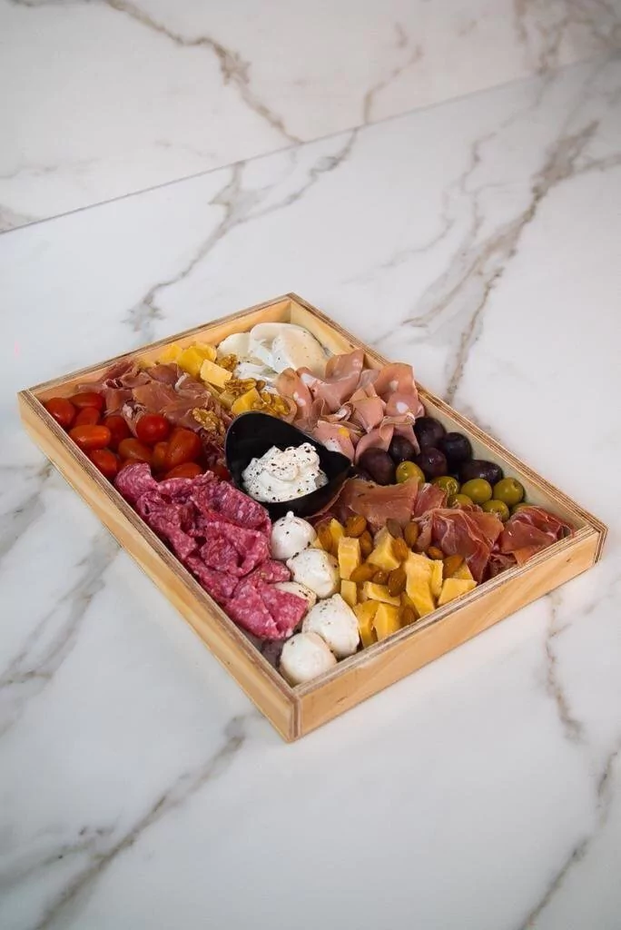 Contiene 3 fiambres y 4 quesos, acompañada de frutos secos y aceitunas especialemente seleccionadas.