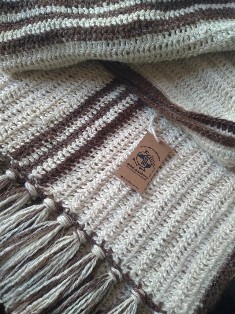 Pie de camaTejido en agujasLana de oveja y llamaTejido artesanalTejoso rusticoHilado a mano por pueblo andinoPesado y muy abrigadoColor natural en ovejaLineas en llama marronProducto Unico.Medidas: Largo 2.10 sin flecosCon flecos 2.40 mts,Ancho 48 cmPeso: 1200 KgArtesana: GladysCreado: TilcaraDe no contar con stock, el tiempo de tejido es de 10 diacode 171
