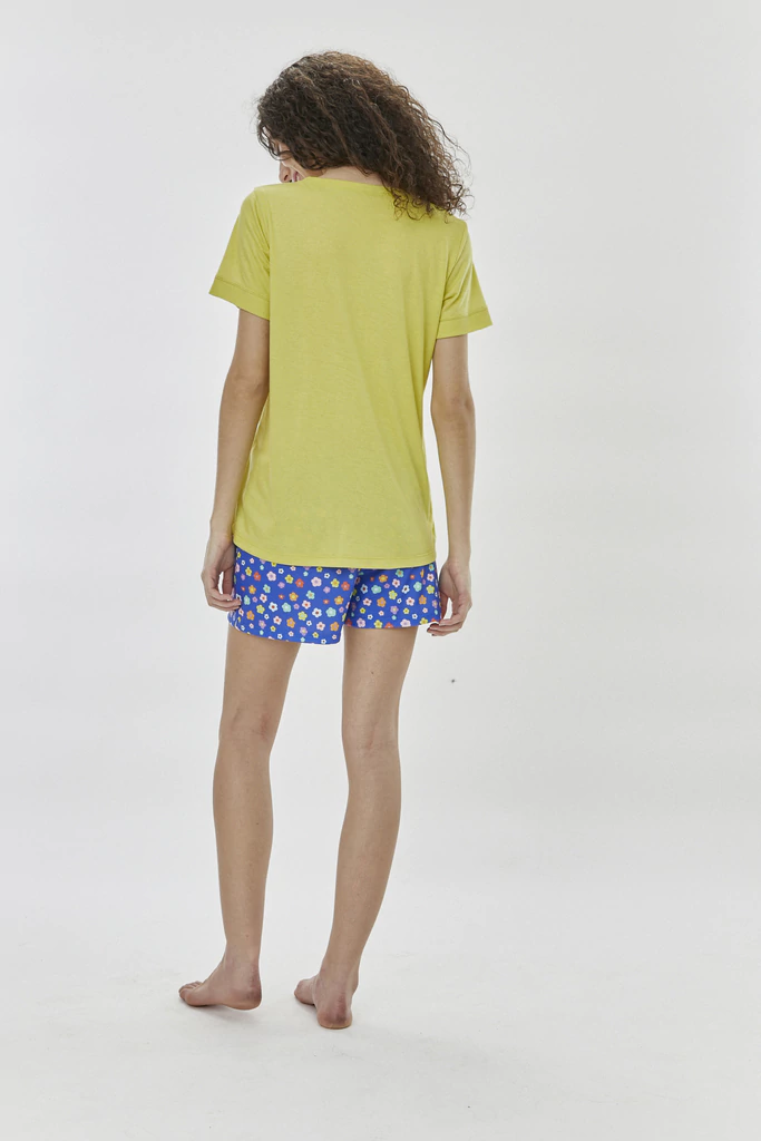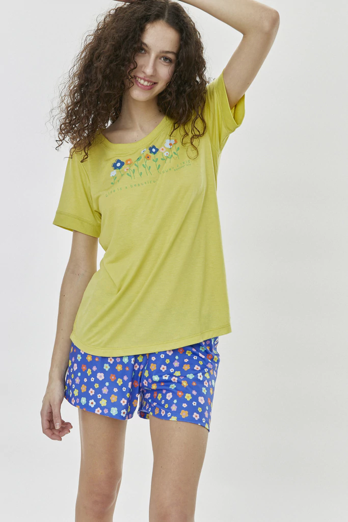 DESCRIPCIÓNElPijama Alegraes la elección perfecta para tus noches.Confeccionado en jersey de viscosa/algodón, su remera de manga corta te ofrece suavidad, mientras que el short dejersey con lycraen un vibrante color azul con pequeñas flores aporta comodidad y estilo.Beneficio:Comodidad y frescura para un descanso reparador.