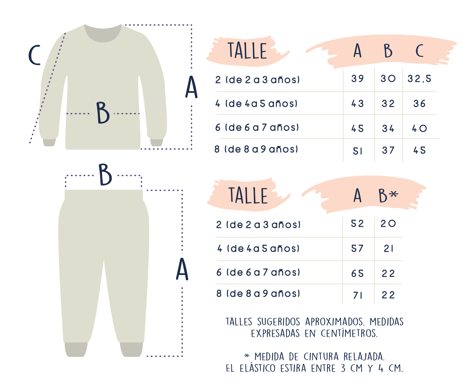 Te recomendamos que para elegir el talle tomes en cuenta las medidas de la tabla que se encuentra a continuación y no las edades de referencia, ya que la edad es a nivel general y depende mucho de la contextura. Podés medir una prenda que le quede bien y compararla con nuestras medidas.