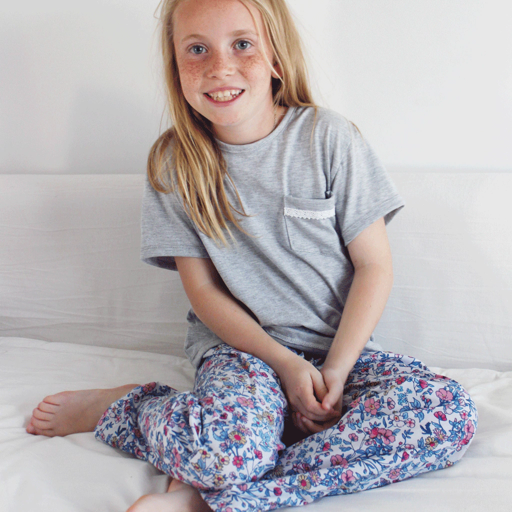 Remera de jersey gris melange con bolsillo con detalle de puntilla de algodón blanca + Pantalón de poplin estampado con detalle de tira del mismo género en la cintura