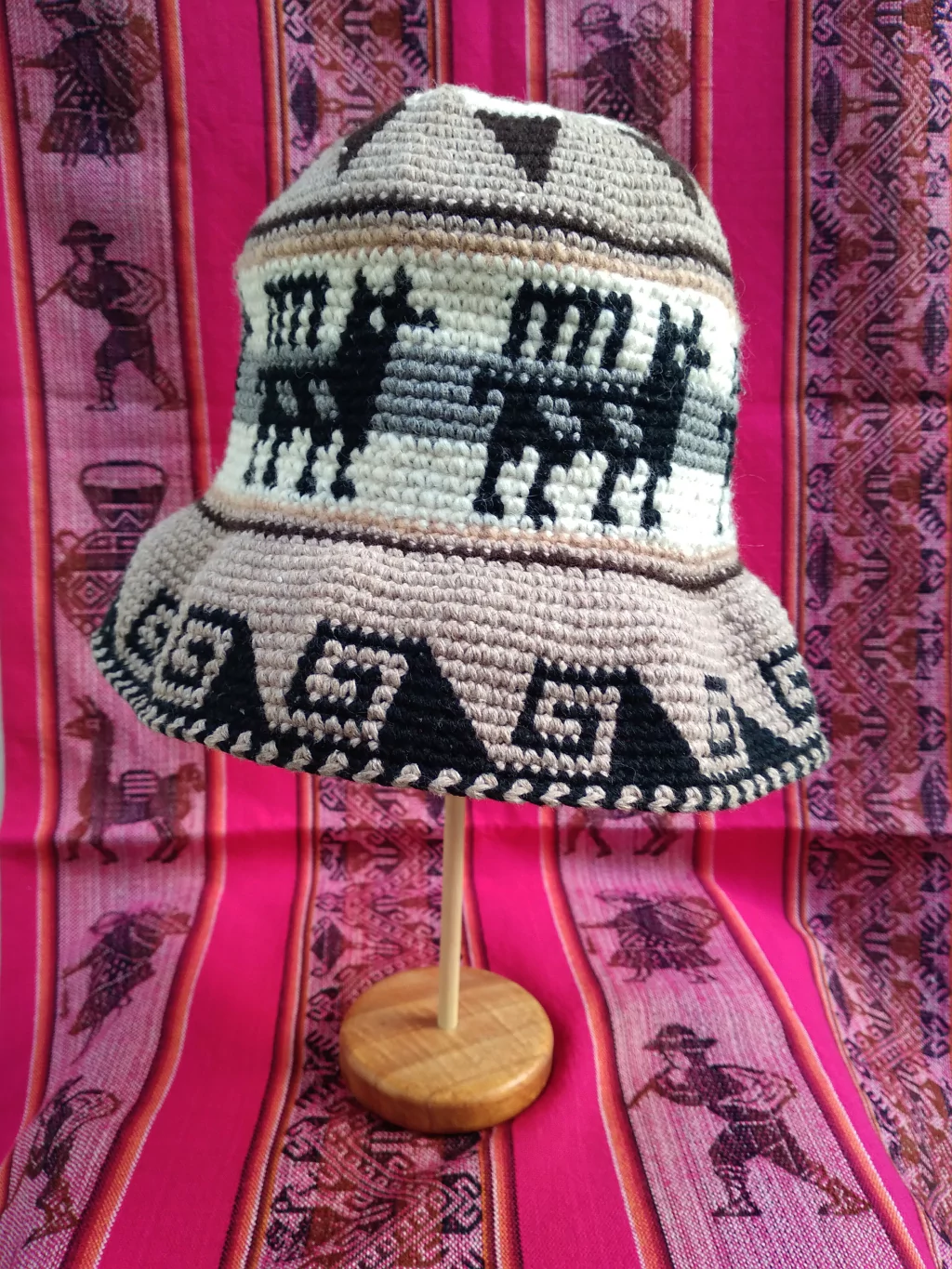 Gorros pilusosModelo: choscoMaterial: lana de ovejaDibujos andinos:Color de fondo: BeigeFranja en Crudo con lineas en gris y negroDibujo superior : Estrella blanco y negroNo lavar en lavarropas, no centrifugarColor: code # 11