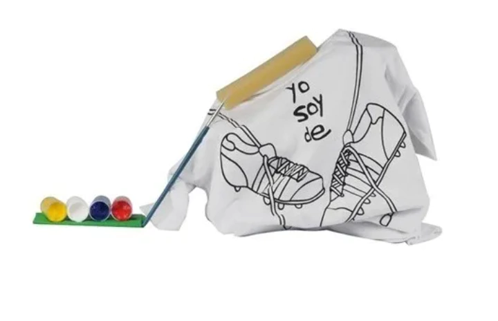 Es un bolso de plástico que se desarma y se transforma en un pintorcito, con todo para pintar una remera de fútbol, de tu equipo favorito!Contiene en sus bolsillos:1 remera de manga corta, blanca, con la impresión de unos botines de fútbol (que quedan como colgados del cuello) y el "yo soy de"4 pinturas para tela asi que puedan pintarlos con los colores de su equipo1 esponja para ir limpiando el pincel1 mantel de plástico (para separar el frente del dorso y que no traspasen los colores)1 pincel
