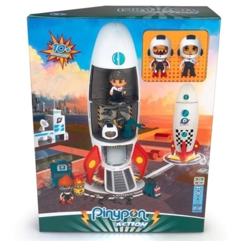Cohete espacial de 4 plantas de Pinypon Action para vivir nuevas aventuras en otras galaxias. En la planta baja está la cabina de desinfección y la primera planta es giratoria con un almacén de cascos y otro de armas. La tercera planta también es giratoria y allí se encuentra la sala de mandos y la cabina del piloto espacial con sillón giratorio. En la cuarta planta está la sala de máquinas donde se almacena un brazo mecánico, un robot y los residuos de la nave. Se puede cerrar el cohete totalmente para jugar a volar de una galaxia a otra. Están incluidas dos figuras de astronautas, uno de ellos es un peligroso impostor.