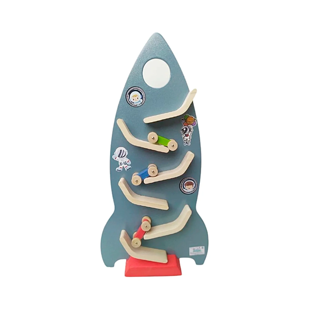 ** ACCESIBBLE JUGUETES **Bajada de autos con forma de cohete. Totalmente de madera, artesanal. De mdf, álamo y palo blanco.Trae 3 autitos de madera, 6 rampas y base.Medidas: 25 x 50 cm.