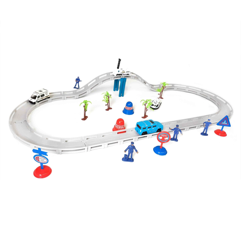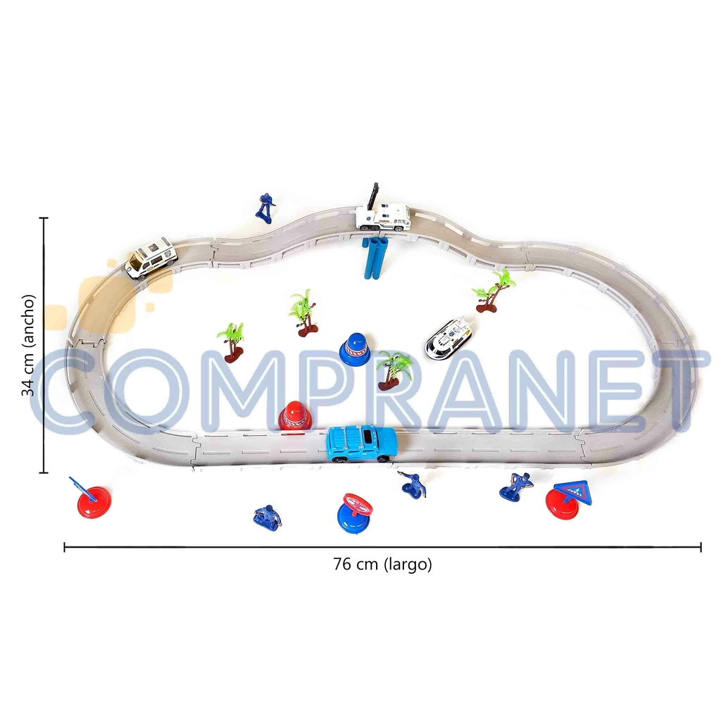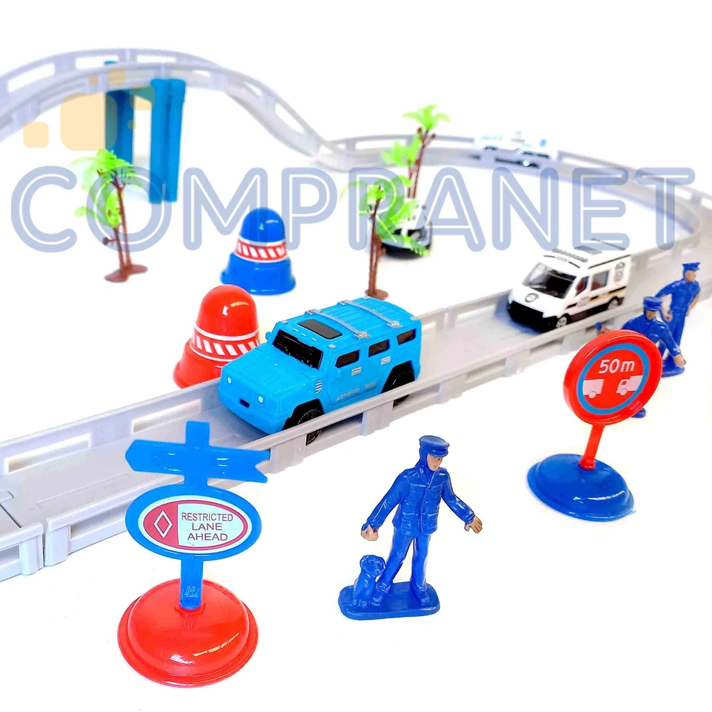 Material: PlásticoLos niños tendrán divertidos momentos jugando.Para uno o varias personas.Es muy fácil de armar y desarmar.Contenido del paquetePista de autos1 auto a pila1 helicóptero2 autos de policía2 camiones de policía1 camioneta policía2 conos de restricción3 señales5 muñequitos de policías4 palmeras1 barra sostenedora la pista