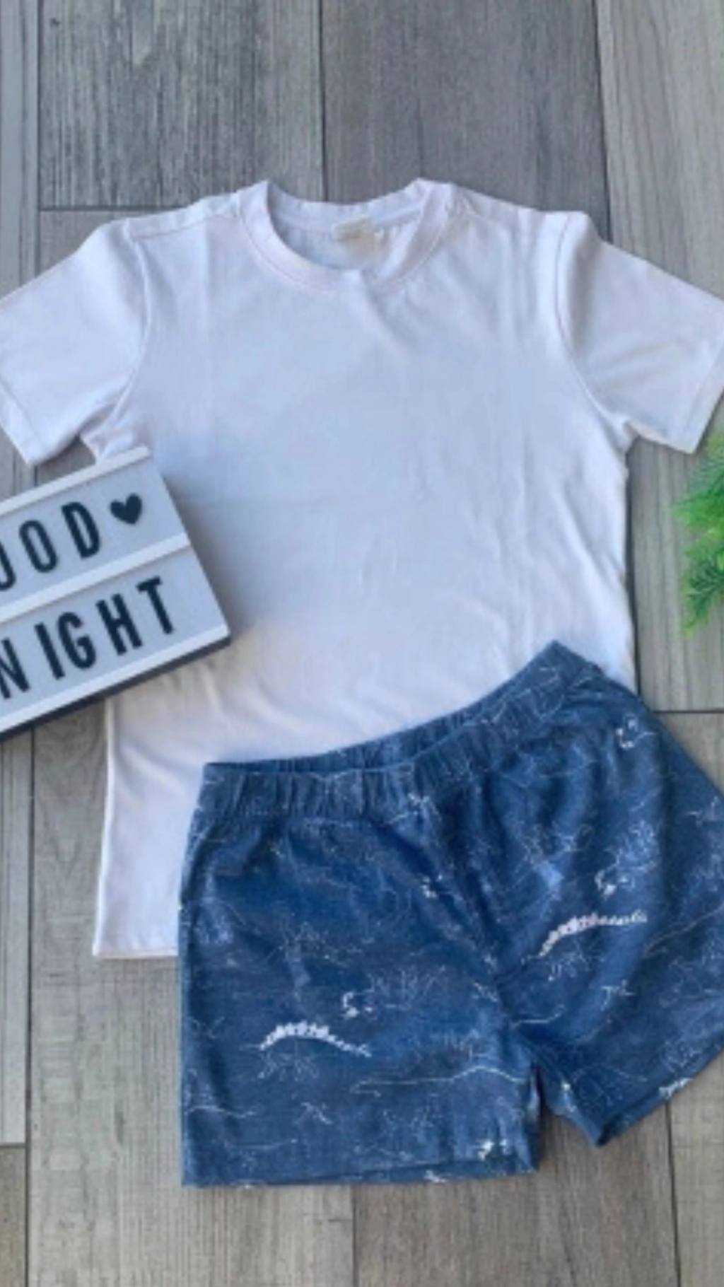Variación del pijama Rex, el short es el mismo pero la remera es blanca. El short tiene un elástico de 4cm en la cintura, y la medida del elástico, está pensado para que no apriete, y la persona pueda dormir cómoda, tiene un estampado con diseño de dinosaurios. El azul del short es jaspeado y esta estampado con dinosaurios de color blanco. La calidad, tanto de la remera, como del short, es excelente, 100% algodón.