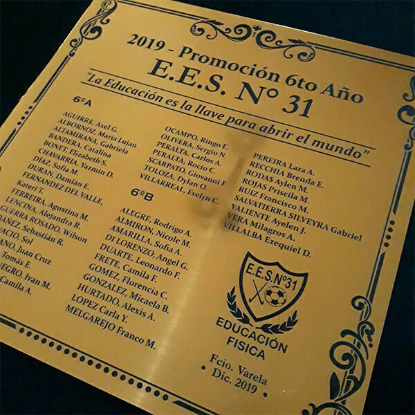 PLACA DE METALEX CON GRABADO LASER-----------------------------------------------------------------------------------------------------------Ideal para entregar como Placa Conmemorativo o utilizar en Señalización-----------------------------------------------------------------------------------------------------------DISEÑO INCLUIDO - SE COORDINA HECHA LA COMPRA-----------------------------------------------------------------------------------------------------------MATERIAL:- Material: Metalex + Cinta Bifaz- Color de fondo: Dorado o Plateado- Color de texto: Negro- Espesor: 1,25 mm------------------------------------------------------------------------------------------------------------TIEMPO DE DEMORARealizamos por encargo. Una semana aprox. dependiendo el trabajo------------------------------------------------------------------------------------------------------------ENVÍOSEnviamos por Correo ArgentinoPodes consultarnos el valor indicandonos tu CODIGO POSTAL*** Ofrecemos servicio de Motomensajería Zona Sur - Microcentro. ***------------------------------------------------------------------------------------------------------------RETIRO EN PERSONASe puede retirar por Oficina en Lanús Este, de lunes a viernes.Estamos cerca de Estacion Lanús.
