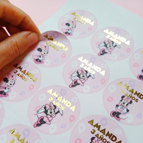 DESCRIPCIÓN:>> Plancha de etiquetas, impresas en papel autoadhesivo blanco mate. A color con elnombre y años en foil,con tono elegido según temática.