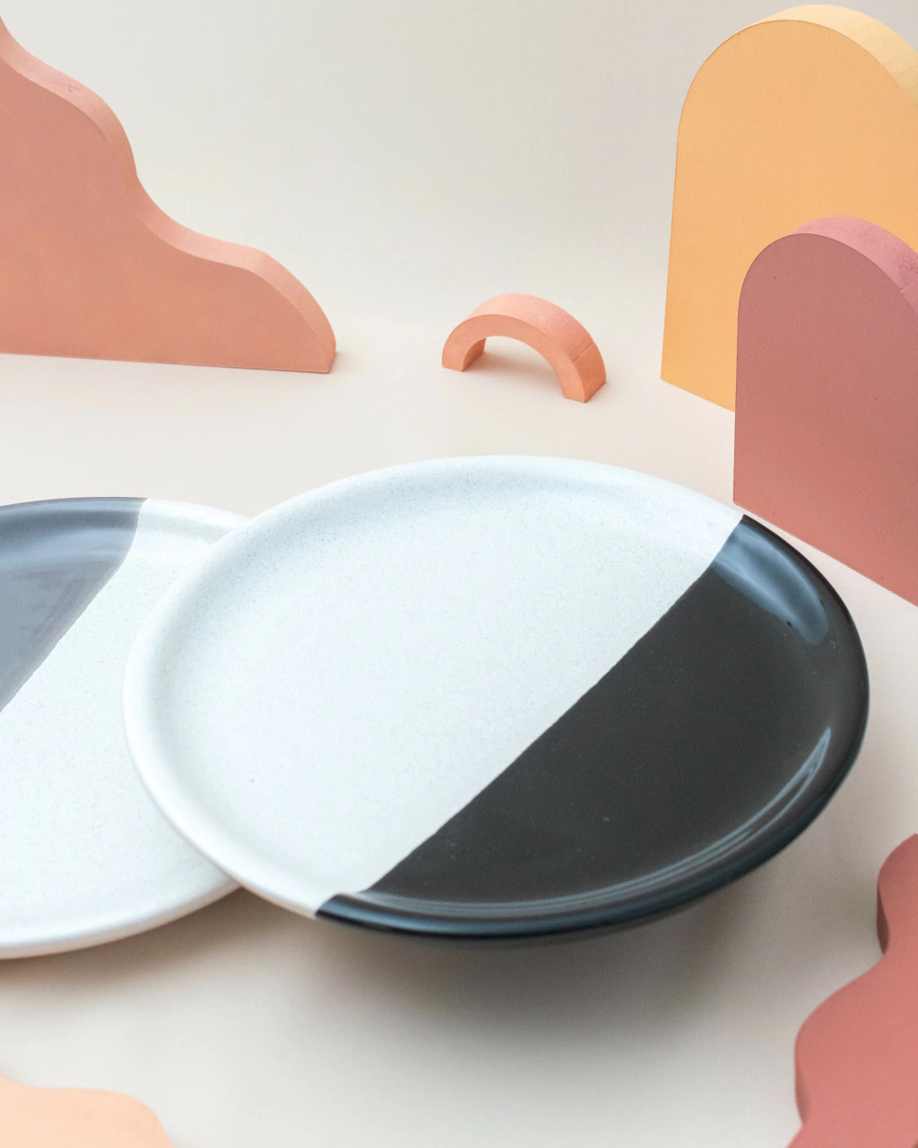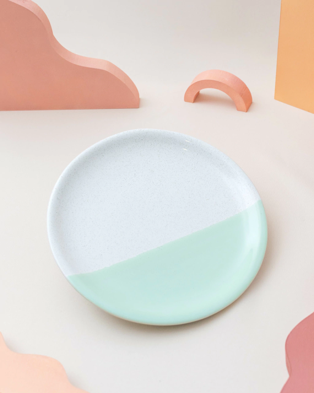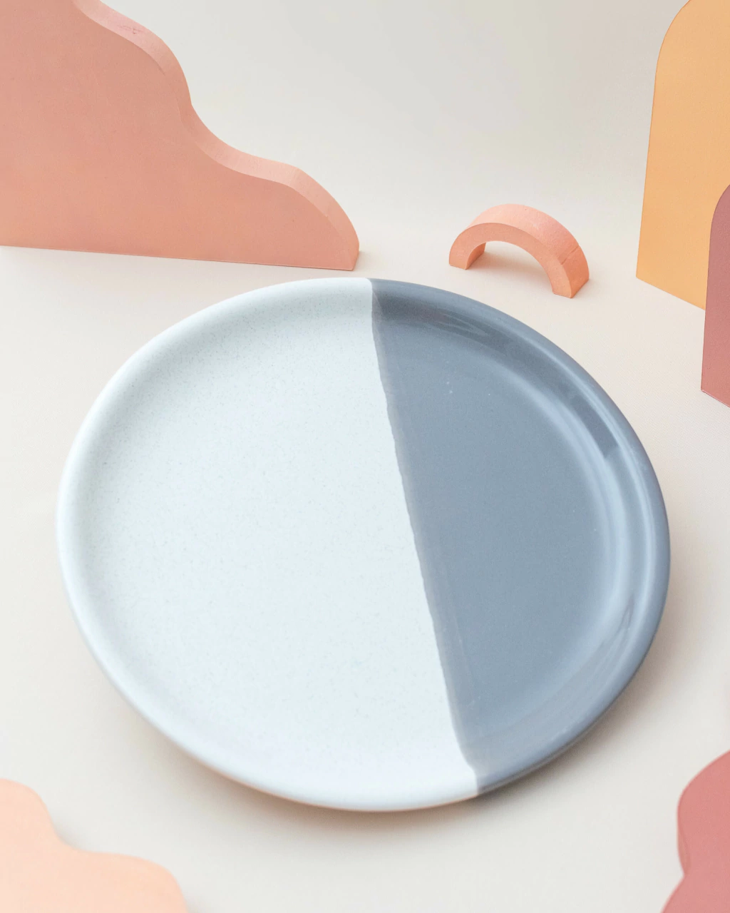 El Plato Playo Balvanera es perfecto para acompañar todas tus comidas con un toque distinto. Tiene una base jaspeada y una mitad de color que podés elegir de nuestra paleta para combinarla a tu gusto.