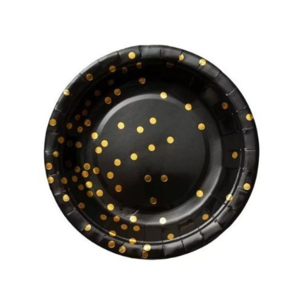 Platos de polipapel con diseño de pintitas doradas y fondo color blanco o negro. Vienen por pack de 8 unidades. Son ideales para temáticas de bautizo, comunión o cumpleaños con dorado