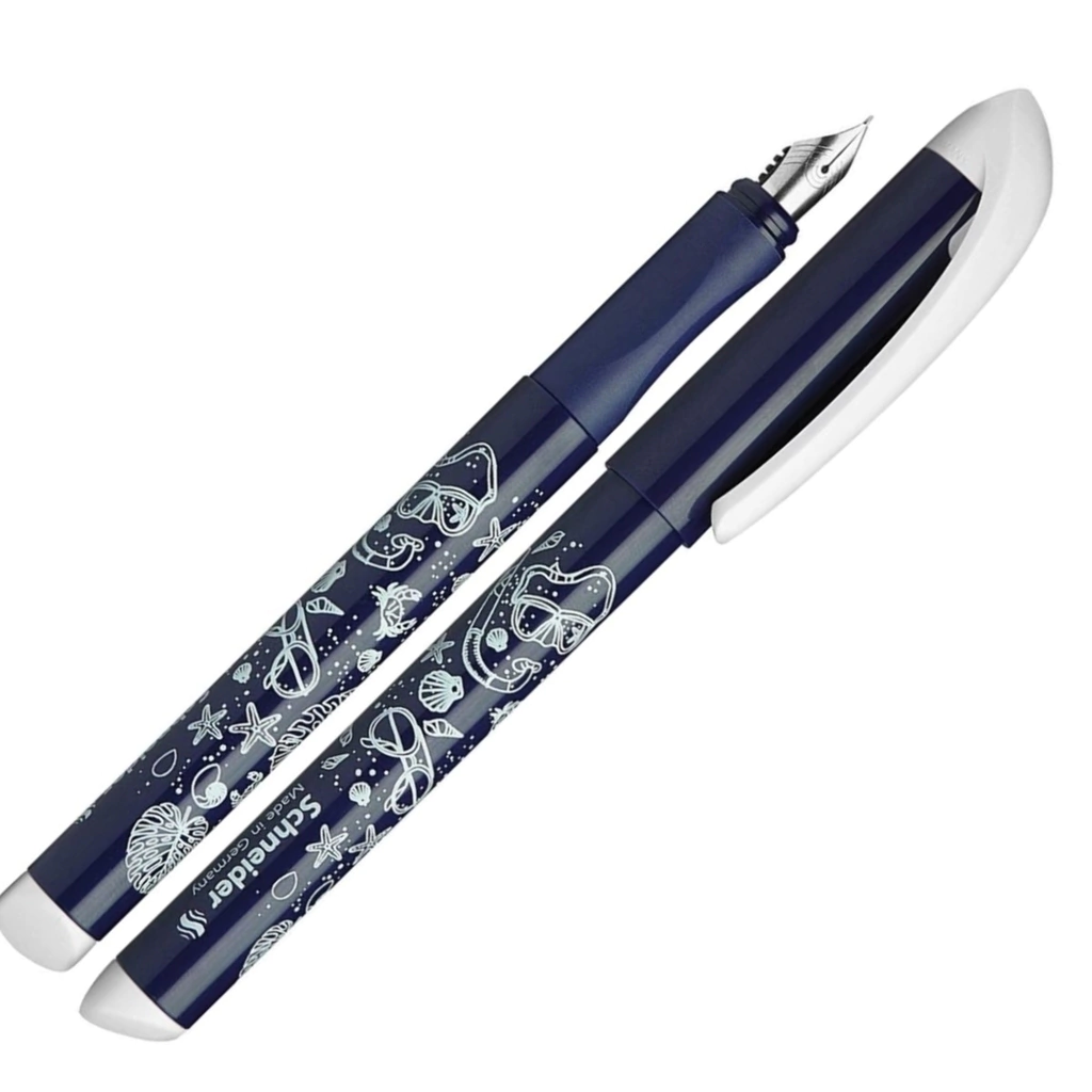 Plumín de acero. Empuñadura ergonómica de caucho. Utiliza cartuchos estándar europeos. Origen: Alemania.