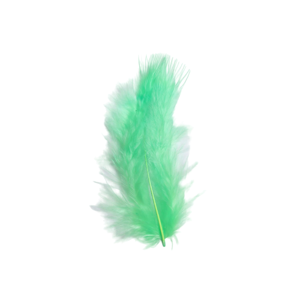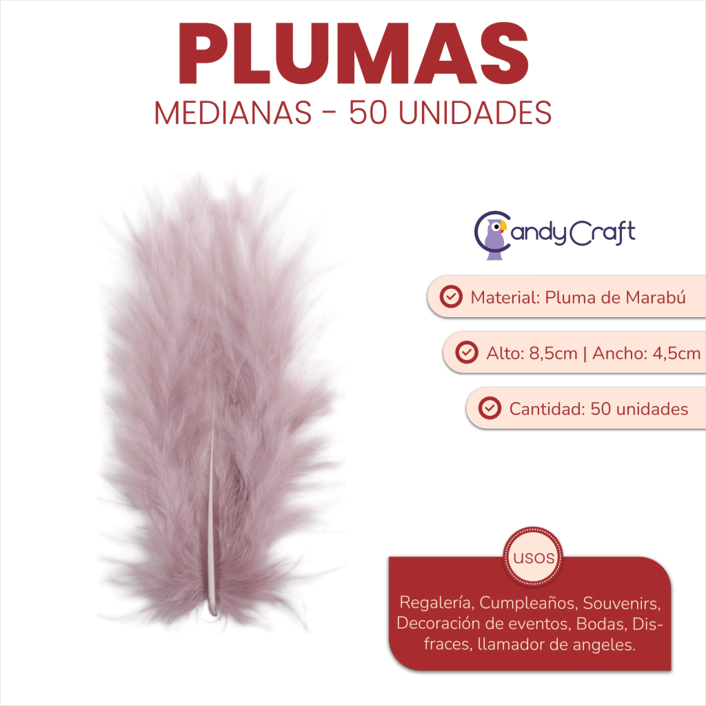 Medida Alto: 8.5 cm. Ancho: 4.5 cm. Cantidad: 1 Bolsa con 50 plumas Material:  pluma de Marabú Uso: Regalería, Cumpleaños, Souvenirs, Decoración de eventos, Bodas, Disfraces, llamador de angeles.