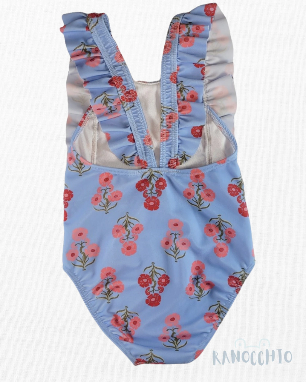 Descubre el estilo único de nuestro traje de baño Pocky Sello Celeste, diseñado especialmente para las más chiquitas. Este modelo cuenta con volados frontales, combinando con sellos florales que evocan la frescura de la primavera.