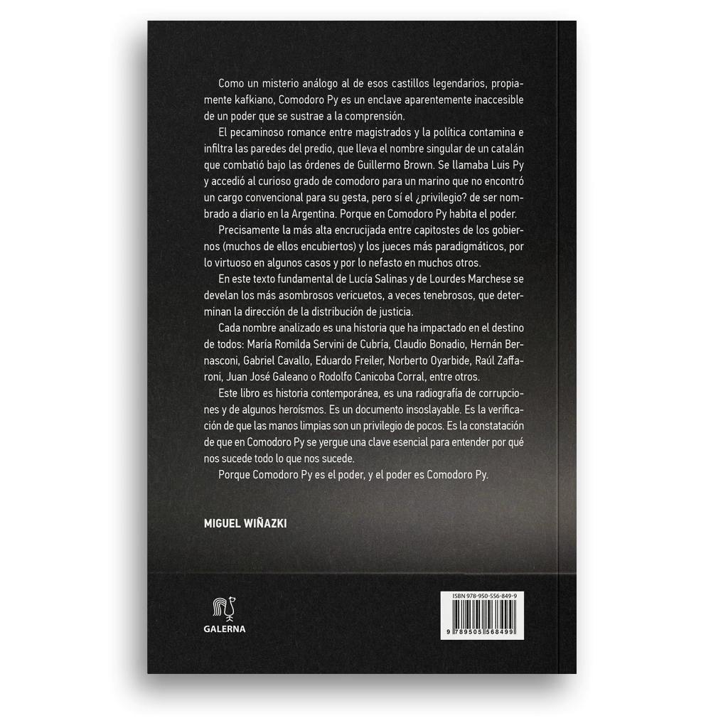 “En este texto fundamental de Lucía Salinas y de Lourdes Marchese se develan los más asombrosos vericuetos, a veces tenebrosos, que determinan la dirección de la distribución de justicia. Cada nombre analizado es una historia que ha impactado en el destino de todos: María Romilda Servini de Cubría, Claudio Bonadio, Hernán Bernasconi, Gabriel Cavallo, Eduardo Freiler, Norberto Oyarbide, Raúl Zaffaroni, Juan José Galeano o Rodolfo Canicoba Corral, entre otros. Este libro es historia contemporánea, es una radiografía de corrupciones y de algunos heroísmos. Es un documento insoslayable. Es la verificación de que las manos limpias son un privilegio de pocos. Es la constatación de que en Comodoro Py se yergue una clave esencial para entender por qué nos sucede todo lo que nos sucede. Porque Comodoro Py es el poder, y el poder es Comodoro Py”. Miguel WiñazkiPáginas: 256Formato: 15 x 23 cmEncuadernación: tapa blanda.ISBN: 978-950-556-849-9