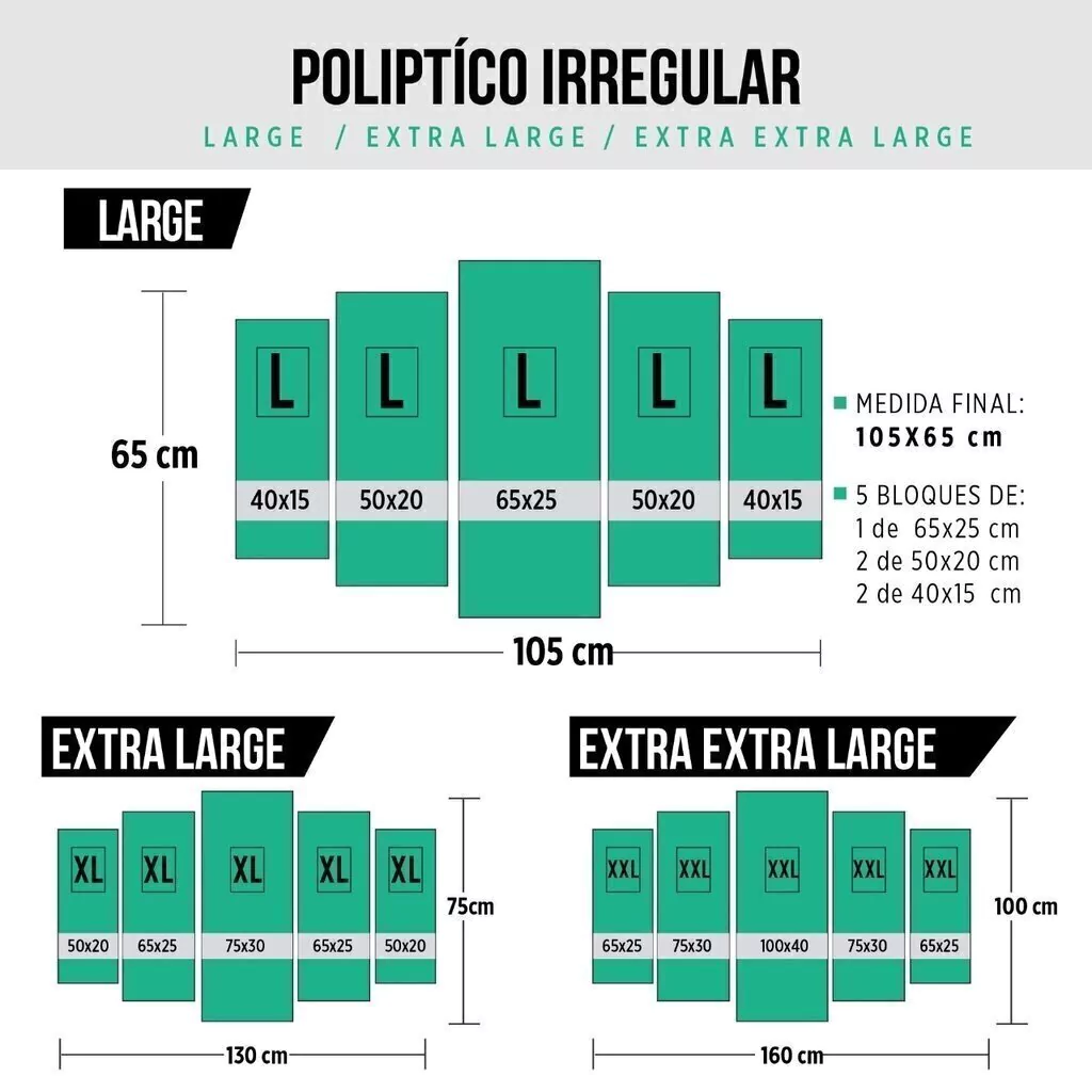 Cuadros elaborados en Lona Blockout impresa  tensada sobre bastidor de madera. Calidad Premium!Tamaños :L 1 cuadro 62x25 cm / 2 cuadros 50x20 / 2 cuadros 37x15XL: 1 cuadro 75x30 cm / 2 cuadros 62x25 / 2 cuadros 50x20XXL: 1 cuadro 100x40 cm / 2 cuadros 75x30 / 2 cuadros 62x25