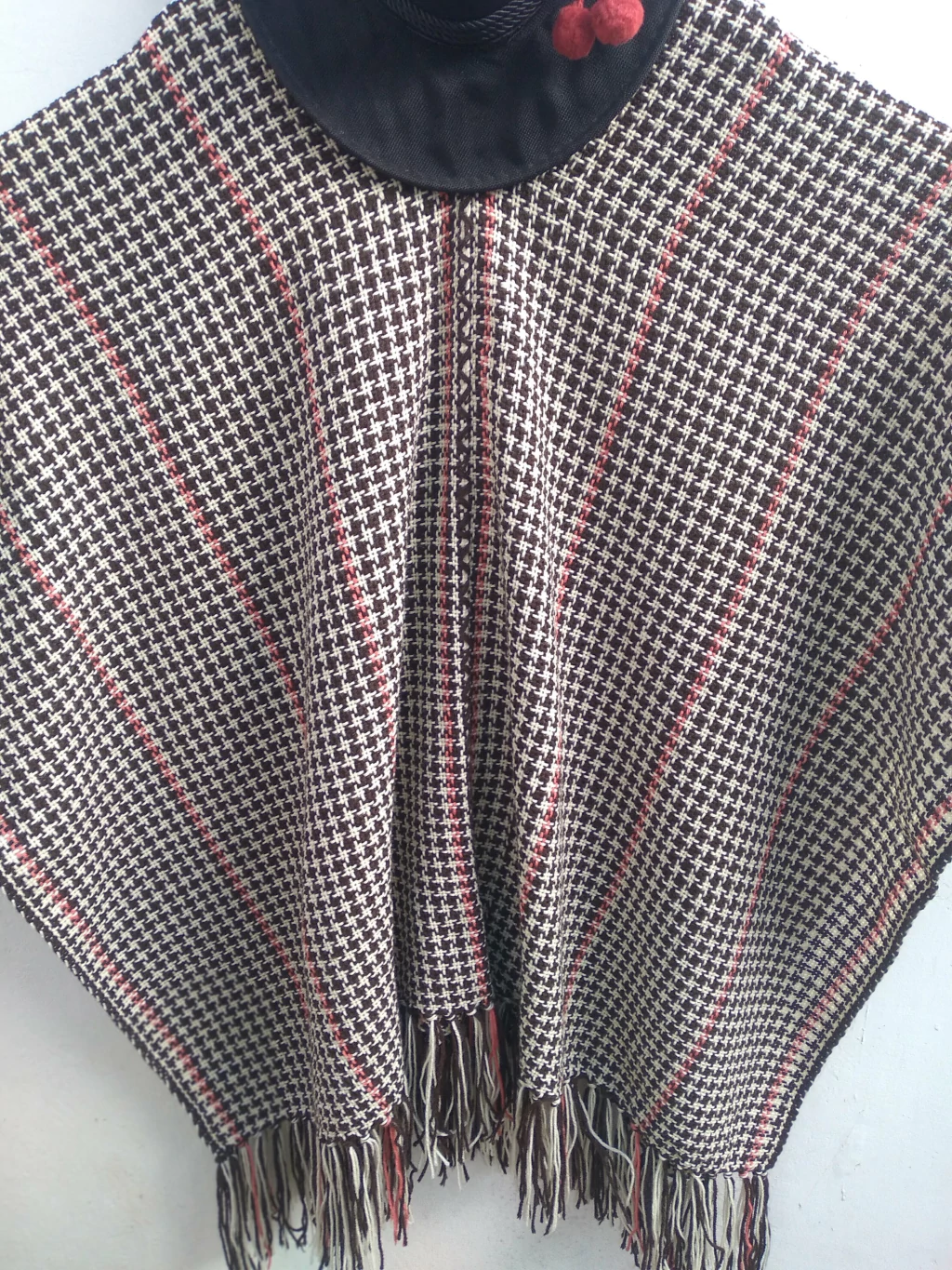 Poncho en Lana de Oveja¡Sumate al estilo único de nuestra tierra con este espectacular poncho tejido a mano!Este poncho en lana de oveja está tejido en telar artesanal, lo que garantiza una pieza única y especial.Lana Original: Completamente hecha con lana delgada y liviana, ideal para cualquier temporada.Diseño Exclusivo: Presenta una base marrón con líneas entrecruzadas en blanco y borravino que le dan un toque moderno y elegante. Medidas Aproximadas:, Ancho: 1,20 mts, Largo: 1,90 mts, Con flecos: 2,00 mts. Creado por la talentosa Gladys de Maimara.Recuerda que al ser un producto artesanal, las medidas son aproximadas.Cuidado: No lavar en lavarropas y no centrifugar para mantener la calidad de la lana.¡No te pierdas la oportunidad de lucir una prenda que refleja la cultura y el arte de nuestro pueblo!Code # 127