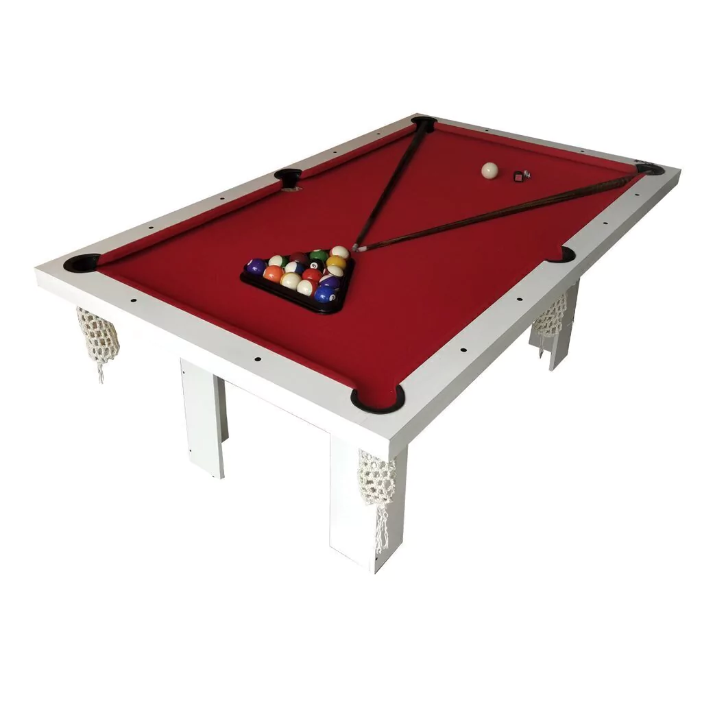 Color de paño a eleccion (verde, rojo o azul). Accesorios incluidos (dos tacos, tringulo, juego de bolas de 57 mm y tiza).
