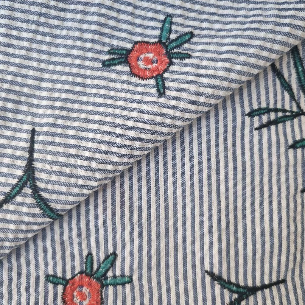 Este poplin bordado es un tejido plano liviano con buena caída. Es una tela delgada, con fluidez ideal para prendas de camiseria, vestidos y polleras. Todas las variantes tienen una base rayada y bordados florales.