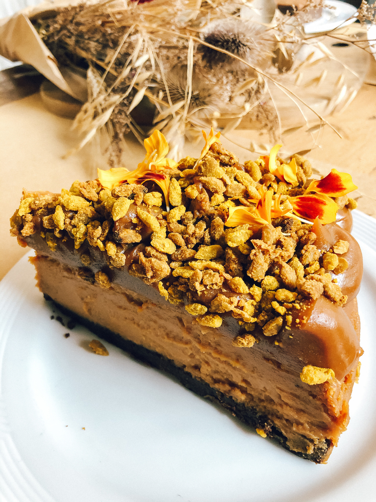 Base sable crocante con relleno de queso y dulce de leche con garrapinada de girasol y cúrcuma.