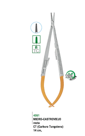 Porta aguja MICRO-CASTROVIEJO, recta 14cm (CARBURO TUNGSTENO)- Alemán Kohler CALIDAD PREMIUM