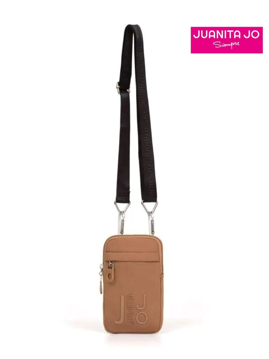 Está confeccionada en novytex efecto neoprene, con un aplique de silicona del logo de Juanita Jo en el frente. Además, cuenta con un bolsillo con cierre adelante y otro bolsillo sin cierre en el dorso.