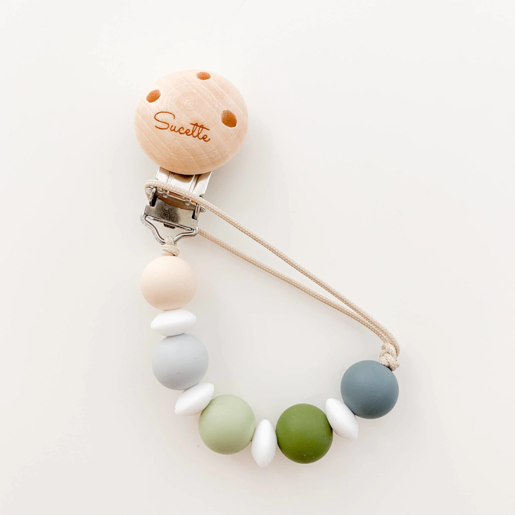 Este modelo incluye cuentas redondas de silicona en color:Crema, Glaciar, Musgo, Oliva y Topoy cuentas separadoras en silicona colorBlanco.ComposiciónLos porta chupetes se confeccionan con cuentas de silicona orgánica antibacteriana de grado alimenticio y libre de BPA, PVC y Ftalafato. El broche en madera cuenta con un sistema tipo cocodrilo metálico, recubierto con un tope plástico para no dañar la ropa. Son 100% no tóxicos.ConfecciónTiene un largo aproximado de 15cm.CuidadosPara higienizar, limpiar con agua y jabón las cuentas de silicona. No sumergir el broche debajo del agua.Importante: No introducir los porta chupetes en ningún artefacto esterilizador porque el calorpuede derretirla pieza plástica que se encuentra en el broche.Siempre inspeccionar el producto y suspender su uso ante cualquier signo de daño.