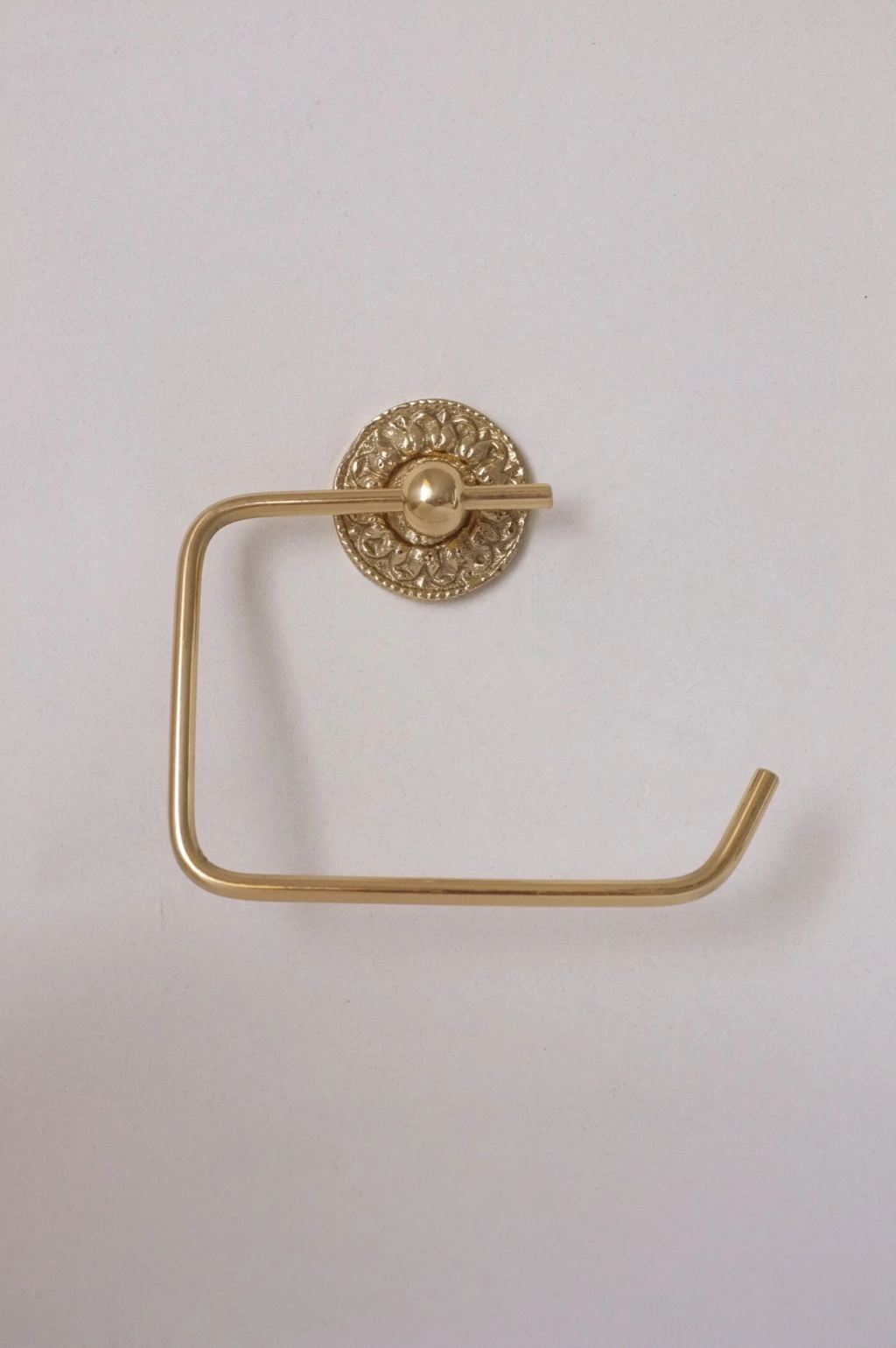 Porta rollo de estilo para pared fabricado en bronce pulido con laca.Medidas:Base: 5 cmAlto: 12 cmAncho: 14 cmProfundidad: 3 cm