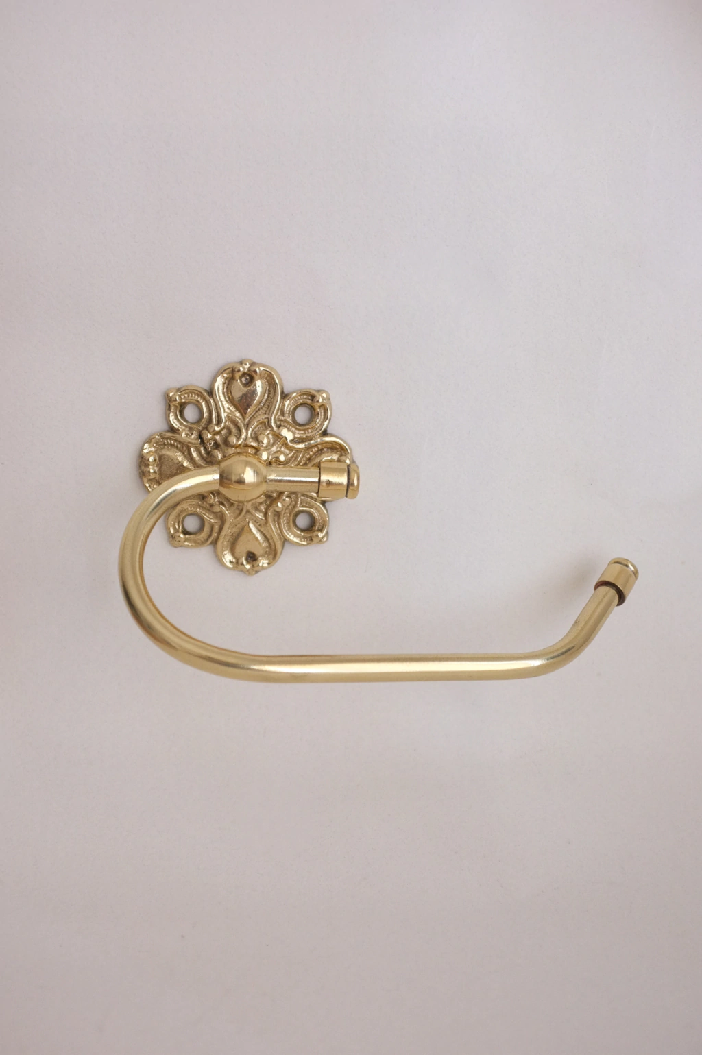 Porta rollo de pared con base de estilo flor fabricado en bronce pulido con laca.Medidas:Roseta de estilo: 8 cmAncho: 20 cmProfundidad: 9 cm