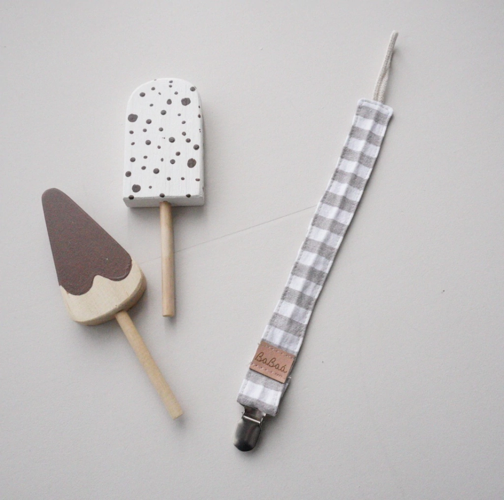 PortachupeteMaterial: tusorColor: Natural rcon rayas lilasDetalles: Etiqueta de ecocuero y broche de metal importado con dientes.