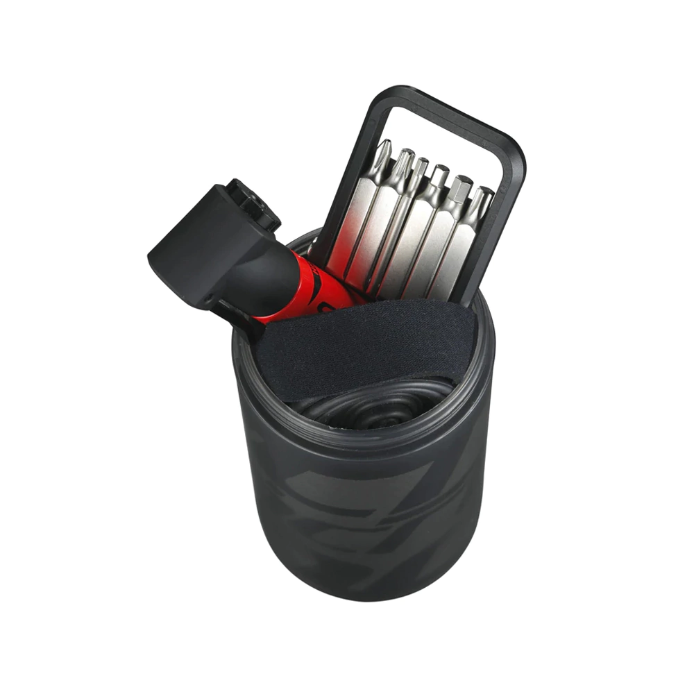 Esta lata de herramientas es una reinterpretación de un bidón de agua Syncros. Está diseñada especialmente para mantener las herramientas, la microbomba y la cámara a salvo del polvo y del agua en un diseño limpio y práctico para cuando lo necesites