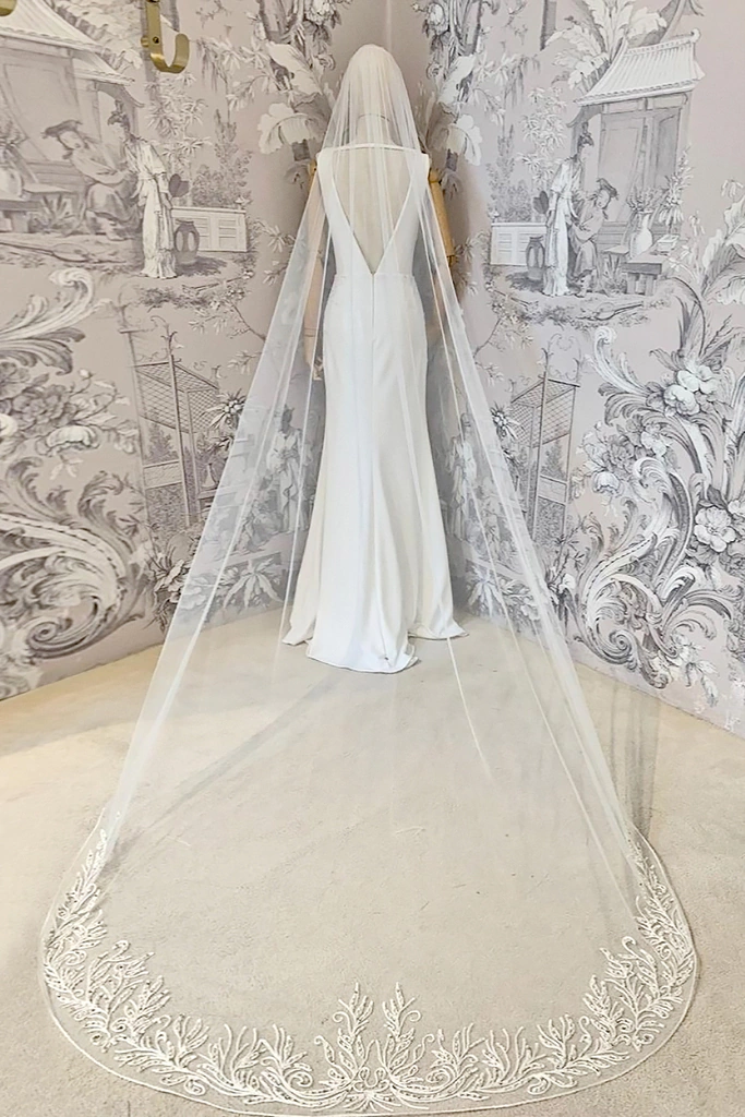 Velo de tul duro con bordado de hilo al tono y realce de perlas y strass.